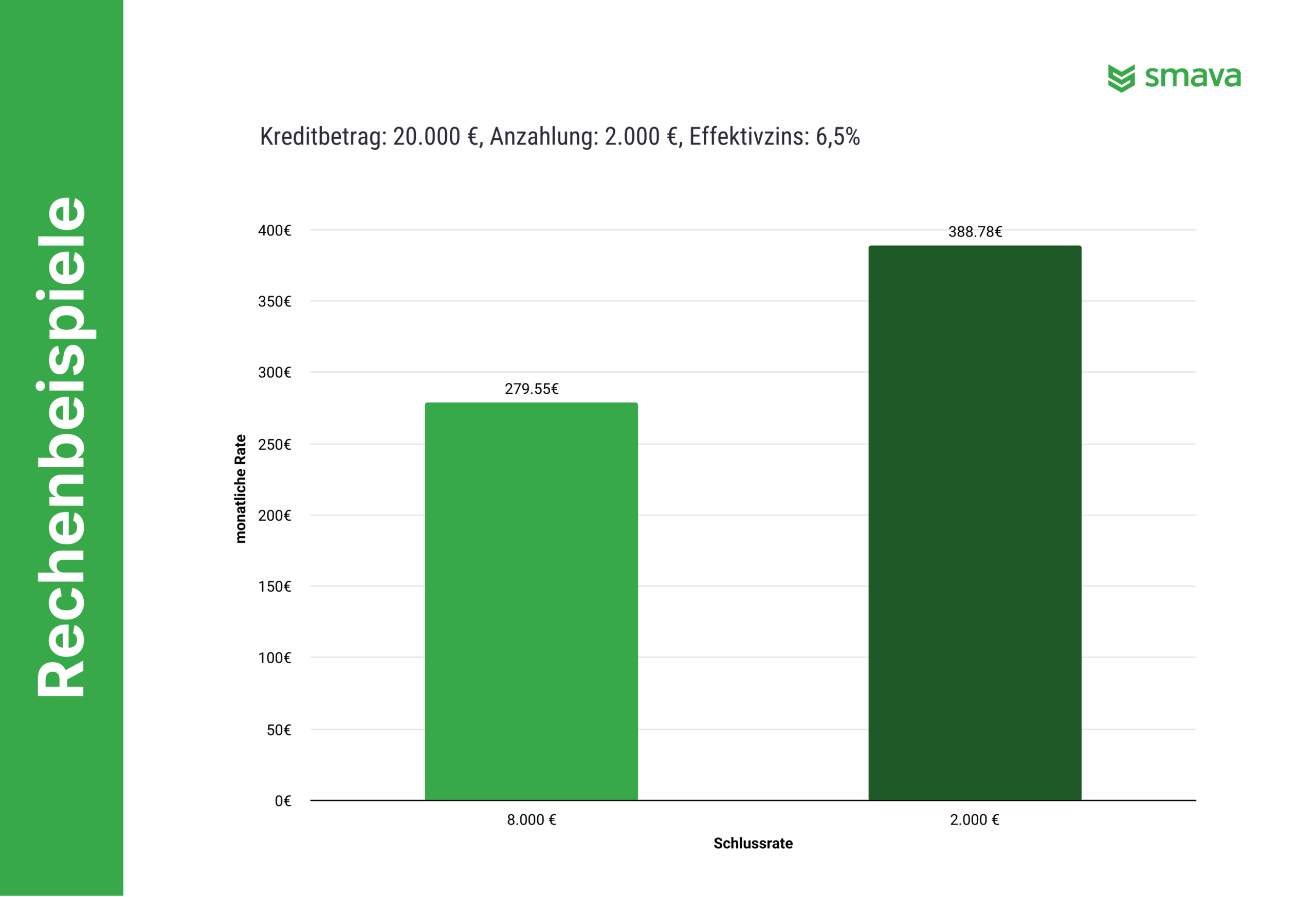 Wir gehen beispielhaft davon aus, dass sich der Kreditnehmer für ein Fahrzeug im Wert von 20.000 Euro entscheidet und 2.000 Euro Anzahlung leistet. Der zu finanzierende Restbetrag beträgt demzufolge 18.000 Euro und die Schlussrate 8.000 Euro. Außerdem gehen wir von einer Laufzeit über 48 Monate und einem effektiven Jahreszins von 6,5 Prozent aus.