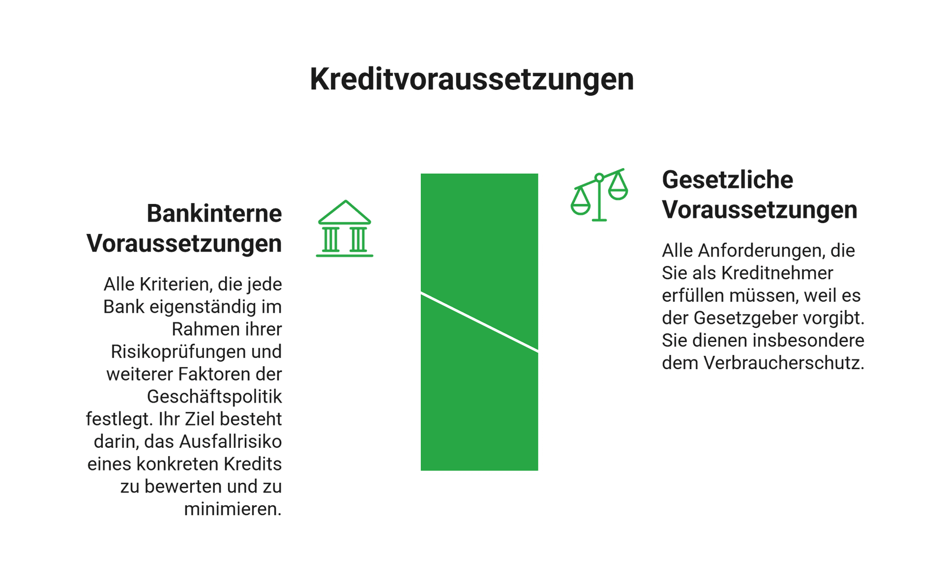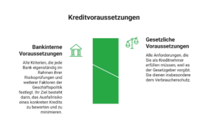 Die rechtlichen Voraussetzungen legen fest, ob Sie als Kreditnehmer infrage kommen. Das heißt, es wird geprüft, ob eine Bank Ihnen einen Kredit geben darf, ohne die gesetzlichen und anderen regulatorischen Vorgaben zu missachten. Dies bezieht sich nicht nur auf Ihre Voraussetzungen, sondern auch auf die der Bank.