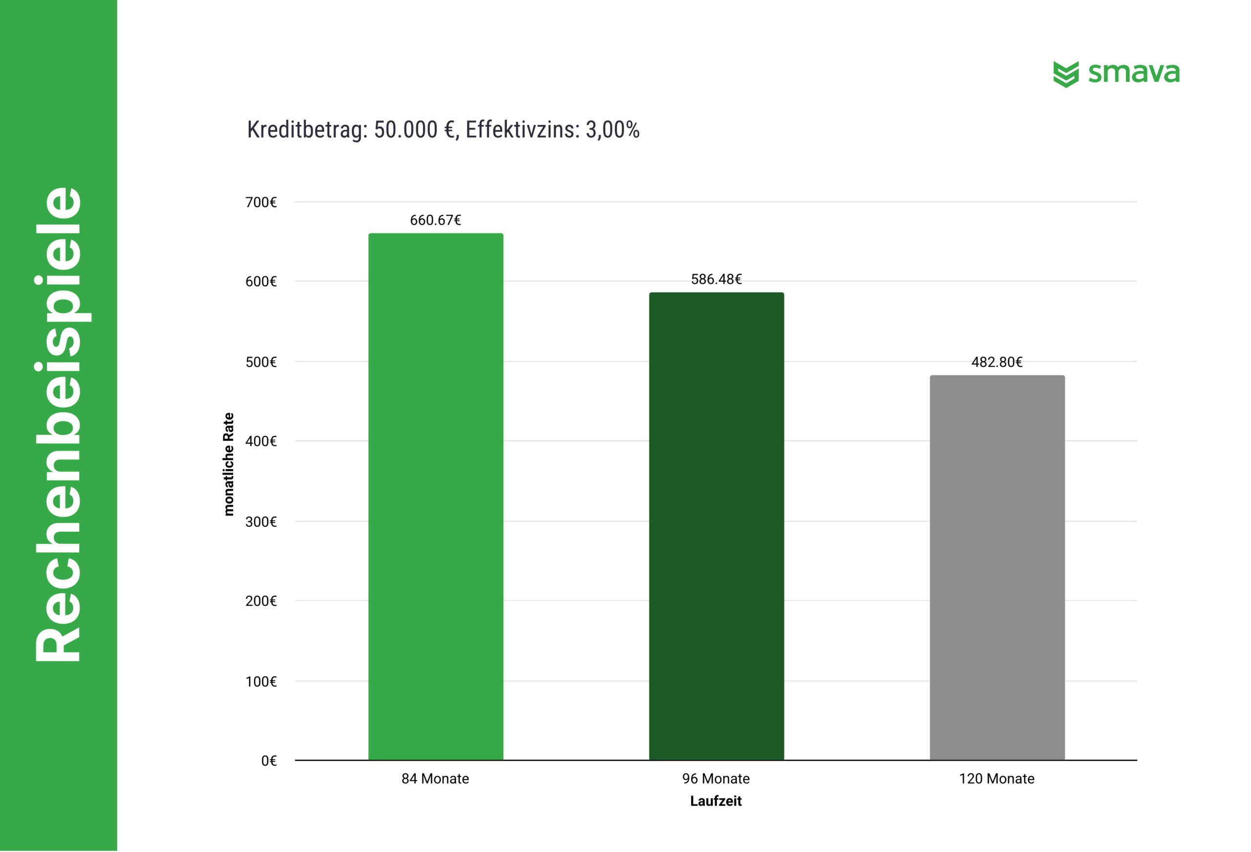 | 50.000 € | 96 Monate | 3 % | 586,48 € | 6.301,95 € |