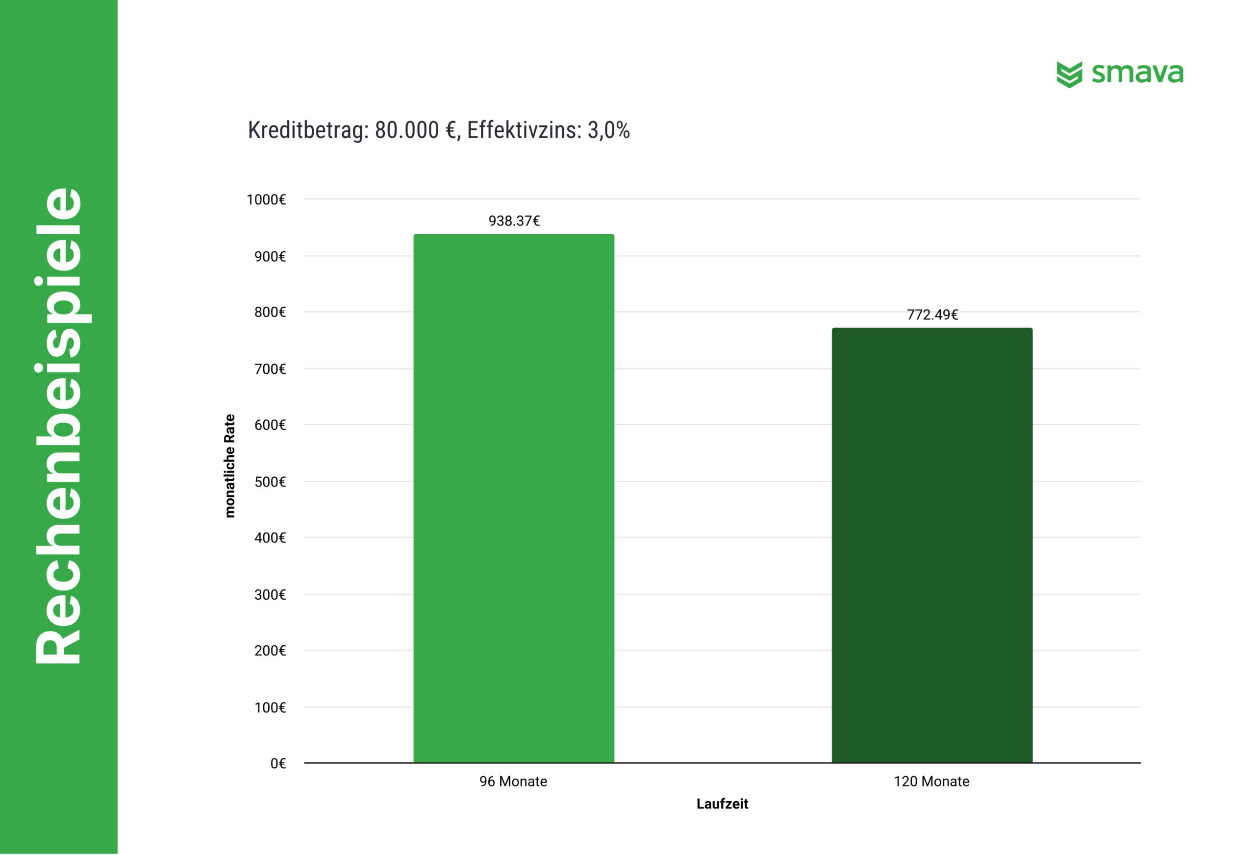 | 80.000 € | 96 Monate | 3,00 % | 938,37 € | 10.083,11 € |