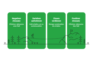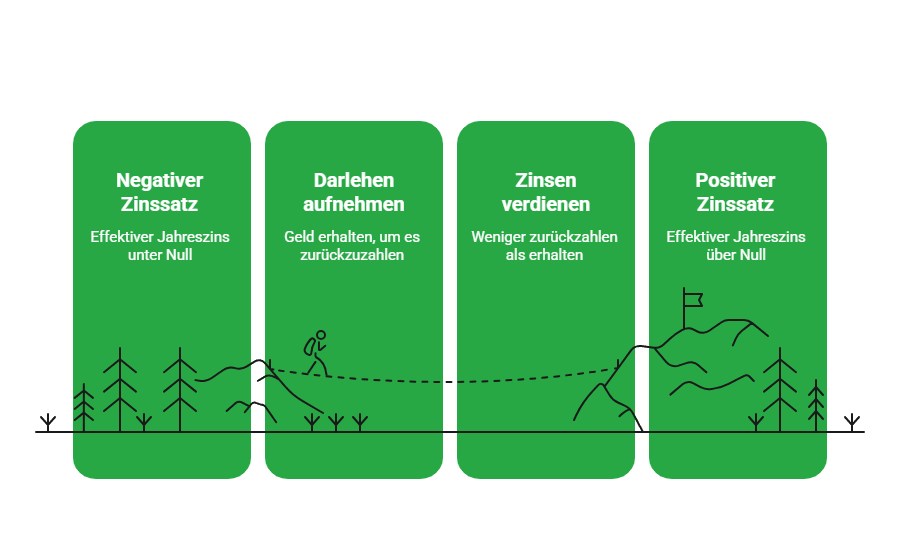 - Für den Darlehensnehmer ergibt sich dadurch eine Rückzahlungssumme, die unter dem ausgezahlten Kreditbetrag liegt, wodurch sich rechnerisch ein negativer Effektivzins ergibt.