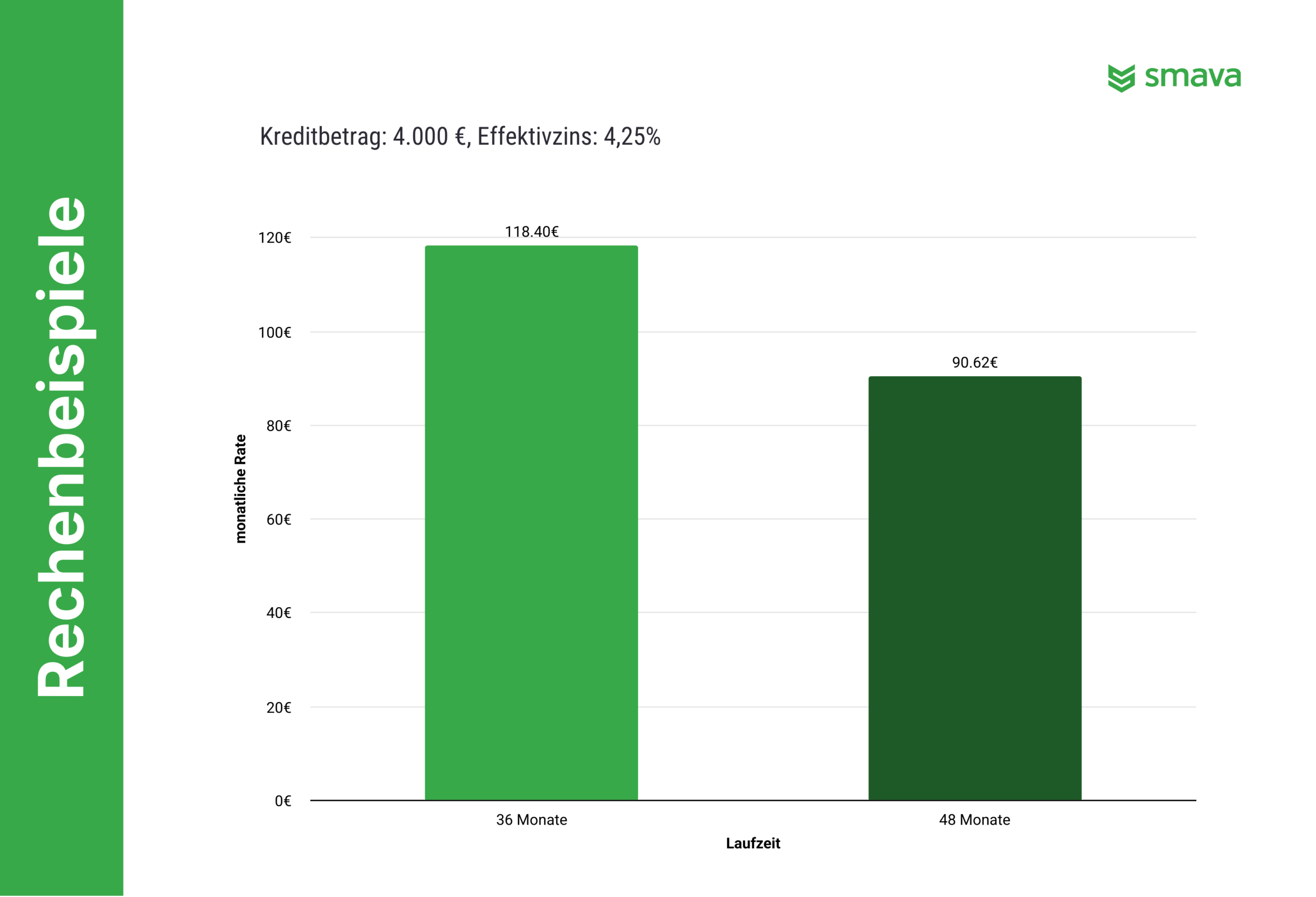 | 4.000 € | 48 Monate | 4,25 % | 90,62 € | 349,75 € |