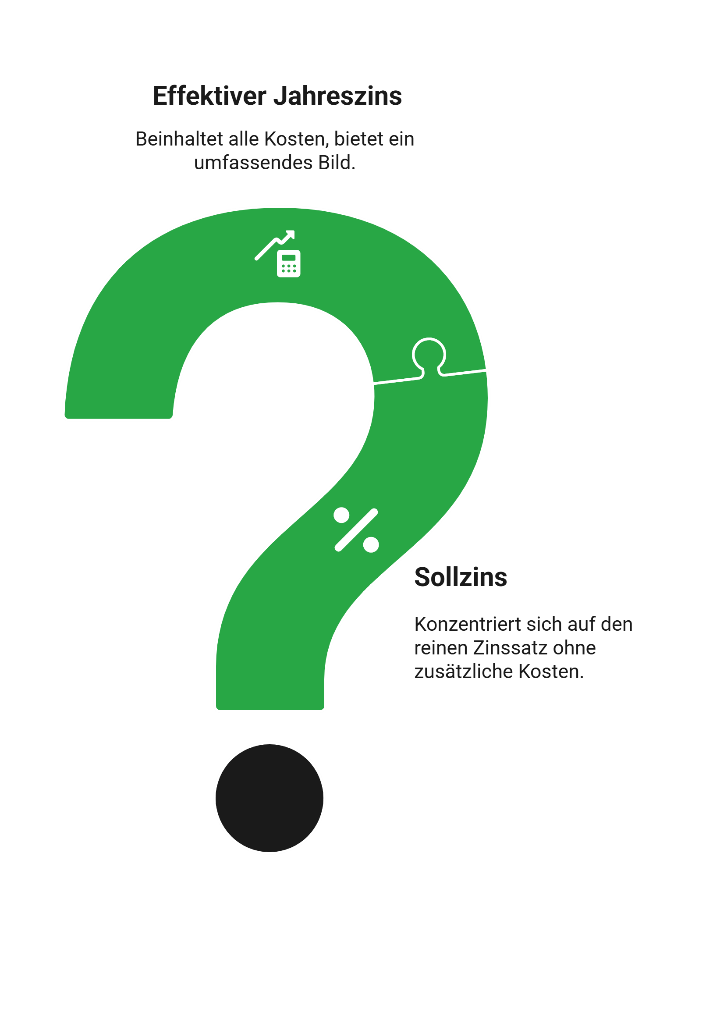 Der Sollzins beschreibt die reinen Kosten für die Kreditaufnahme, also den vereinbarten Zinssatz. Der effektive Jahreszins enthält zusätzlich alle Nebenkosten wie Bearbeitungsgebühren oder Vermittlungskosten. Für den Vergleich mehrerer Kredite ist daher der effektive Jahreszins entscheidend.