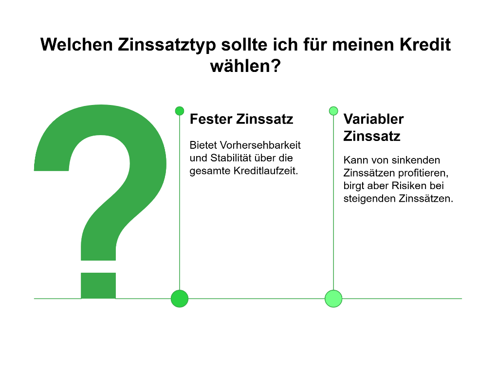 Variabler Zinssatz: Passt sich an die aktuelle Marktentwicklung an. Dies kann Vorteile bringen, wenn das allgemeine Zinsniveau sinkt, ist jedoch mit Risiken bei steigenden Zinsen verbunden.
