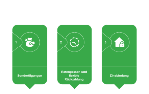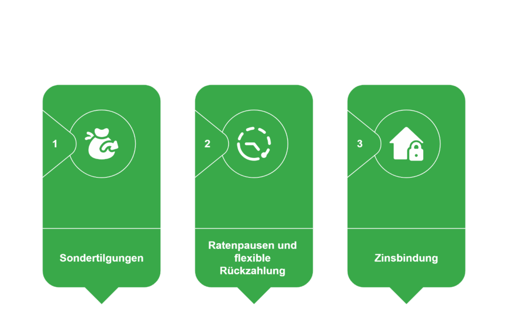 Viele Banken ermöglichen kostenlose oder begrenzte Sondertilgungen, mit denen Sie den Kredit schneller zurückzahlen können. Diese Flexibilität kann zu einem leicht höheren Zinssatz führen, lohnt sich aber langfristig, wenn Sie z. B. durch Bonuszahlungen oder Erbschaften früher tilgen möchten.