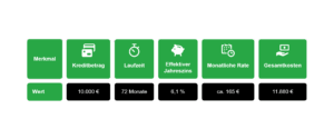 Damit Ihr Studentenkredit nicht nur eine abstrakte Theorie bleibt, kann ein Rechenbeispiel helfen, Ihre Pläne in konkrete Zahlen zu fassen. Die tatsächlichen Kosten sind abhängig vom angebotenen Zinssatz, der gewünschten monatlichen Rate, der Kreditsumme und der Laufzeit.