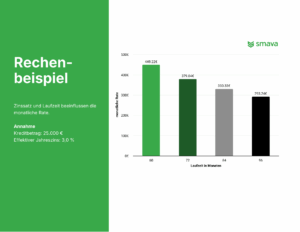 Der Kreditrechner ermöglicht eine anonyme und SCHUFA-neutrale Berechnung Ihrer monatlichen Kreditrate und Gesamtkosten. Sie geben nur wesentliche Eckdaten wie Kreditbetrag, Laufzeit und Zinssatz ein – persönliche Daten sind nicht erforderlich. Das Ergebnis ist eine grobe Orientierung, kein verbindliches Angebot.