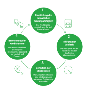 - Das Kreditinstitut eruiert, was Sie sich unter Berücksichtigung aller vorliegenden Faktoren monatlich sicher leisten können.