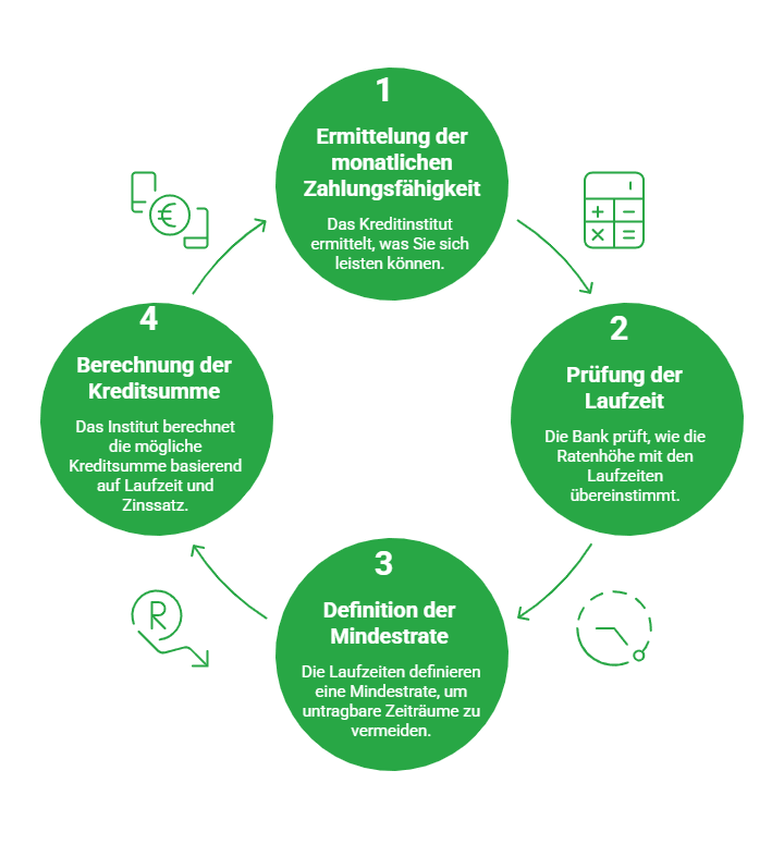 - Anschließend prüft die Bank, wie diese Ratenhöhe mit ihren intern festgelegten Maximallaufzeiten zusammenpasst.