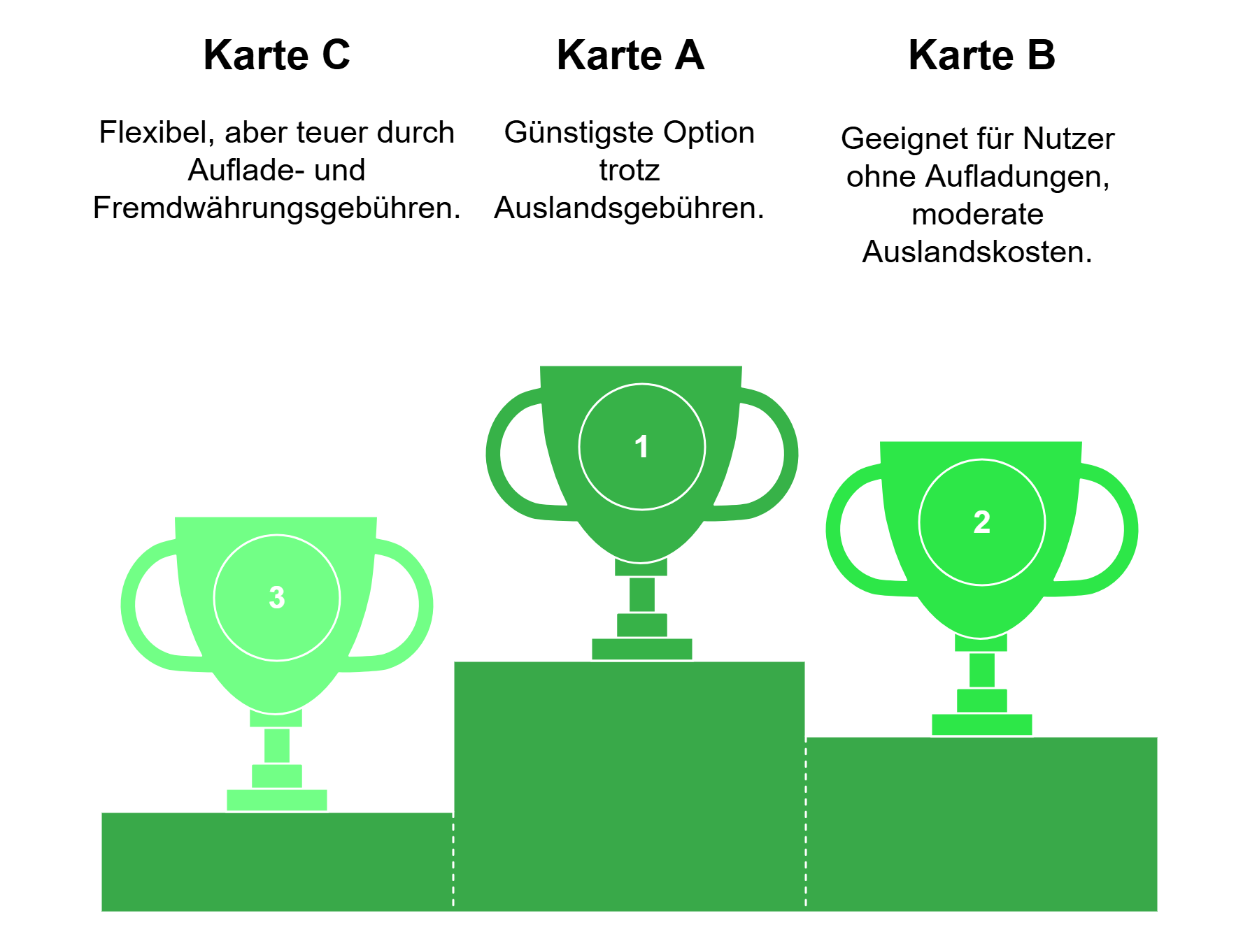 • Karte C wirkt auf den ersten Blick flexibel, wird aber durch Auflade- und Fremdwährungsgebühren schnell teurer