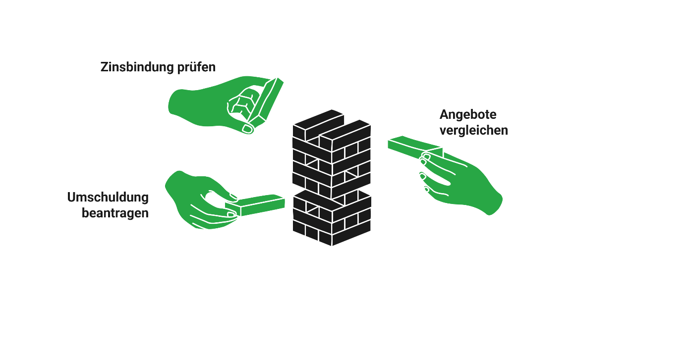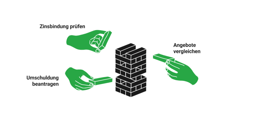 - Umschuldung: Wechsel zu einer neuen Bank. Durch den Wettbewerb zwischen den Anbietern können Kreditnehmer in der Regel deutlich bessere Konditionen erzielen.