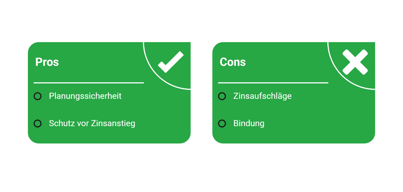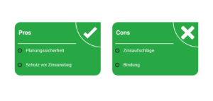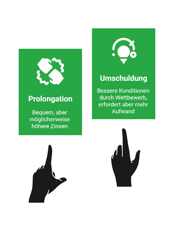 - Prolongation: Verlängerung des bestehenden Kredits bei derselben Bank, oft ohne großen Aufwand, aber meist weniger Auswahlmöglichkeiten bei den Zinsen.